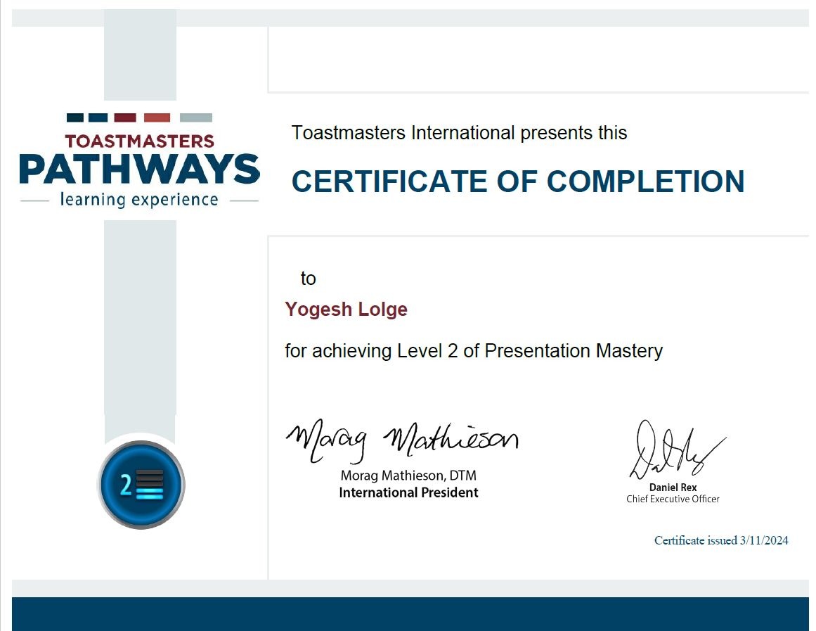 Toastmasters Presentation Mastery Path Level 2 Cert.